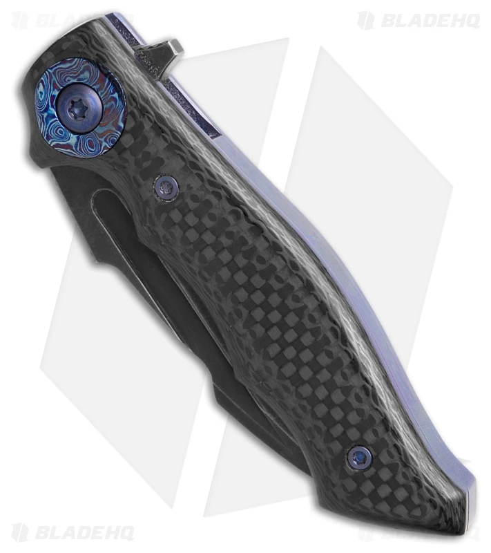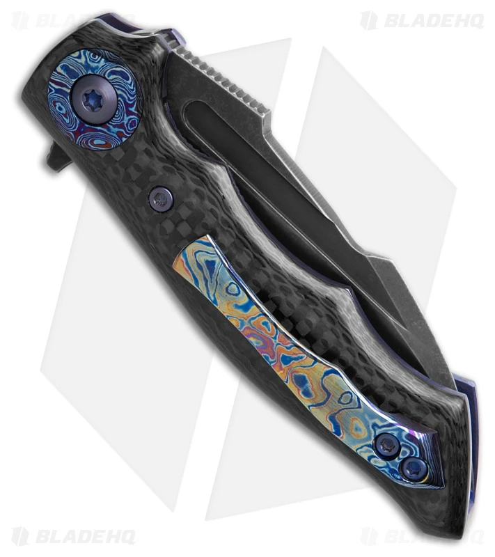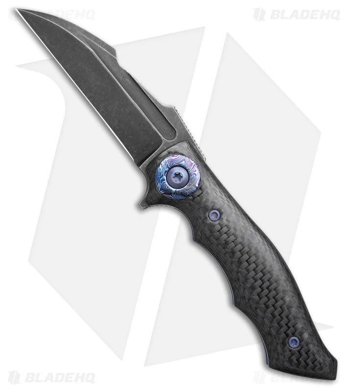 The blade, with its black stonewashed Wharncliffe profile, exudes a sense of mystery. Its muted yet alluring finish reveals a sharpness that suggests an ancient, forgotten purpose—elegant yet deadly. The sleek carbon fiber handle contrasts the blade with a modern sensibility, while subtle Timascus accents on the spine and pivot add an ethereal, almost otherworldly flair. This knife feels like something forged not just from steel, but from the echoes of old-world artisanship.