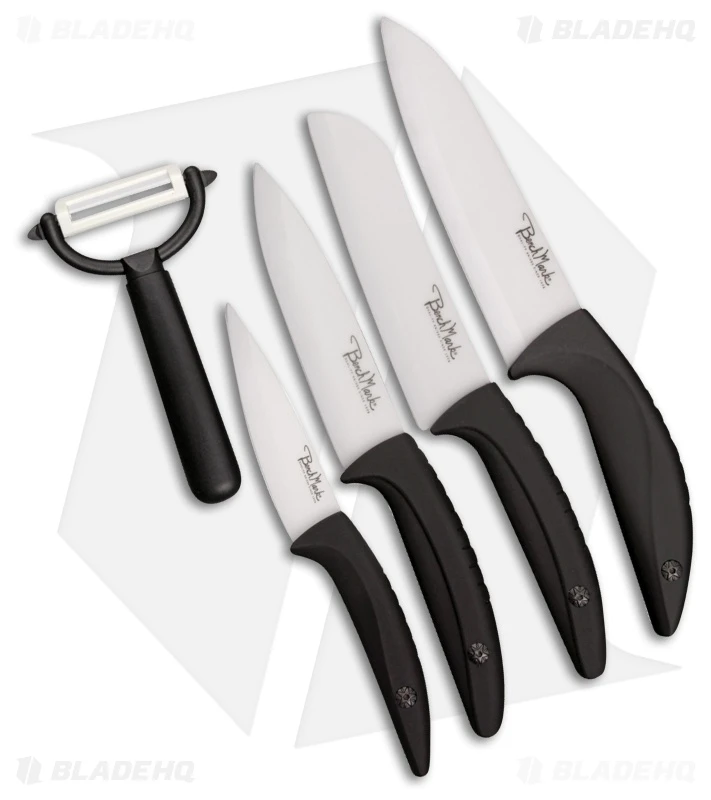The Benchmark 5-Piece Ceramic Kitchen set is a great addition to any kitchen! White zirconium oxide blades maintain an extremely sharp edge while black rubberized handles provide a comfortable and secure grip.