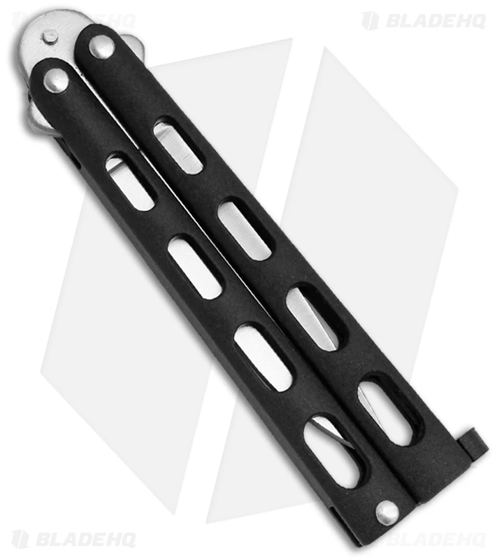 This Small Black Butterfly knife has a drop point style stainless steel blade with a satin finish. The handles are cast metal and feature channel construction and pins. The handles are extra thick with a heavier weight for a solid feel and cutouts for a nice look. The action on this knife is great!