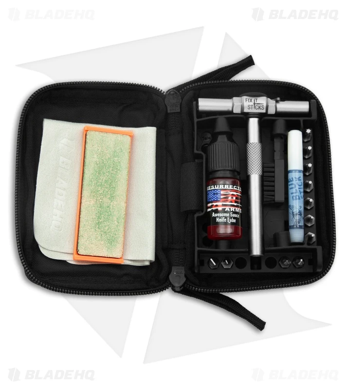 The Blade HQ Knife Maintenance Kit offers essential tools for keeping your knives sharp and functioning optimally. This compact set includes a bit driver with a customized set of bits, a sharpener and strop, lubricant, a cleaning brush, a microfiber cloth, and threadlocker, all housed in a pouch featuring the Blade HQ logo. The pouch also has a large hook and loop patch on the back for attaching all your favorite patches. With this kit, you can keep your knives in prime condition. Get yours today!