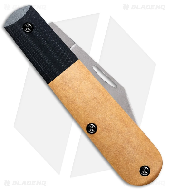 - Handle:Â Tan Richlite handle with elongated black G-10 bolsters and black G-10 liners.