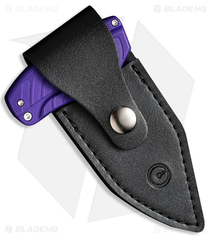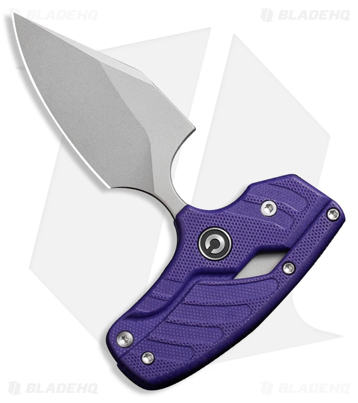 - Purple G-10 handle with a finger groove.