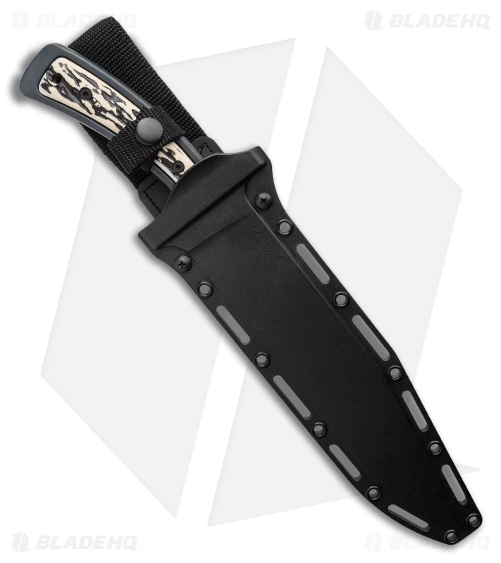- Simulated stag handle scales over full-tang construction.