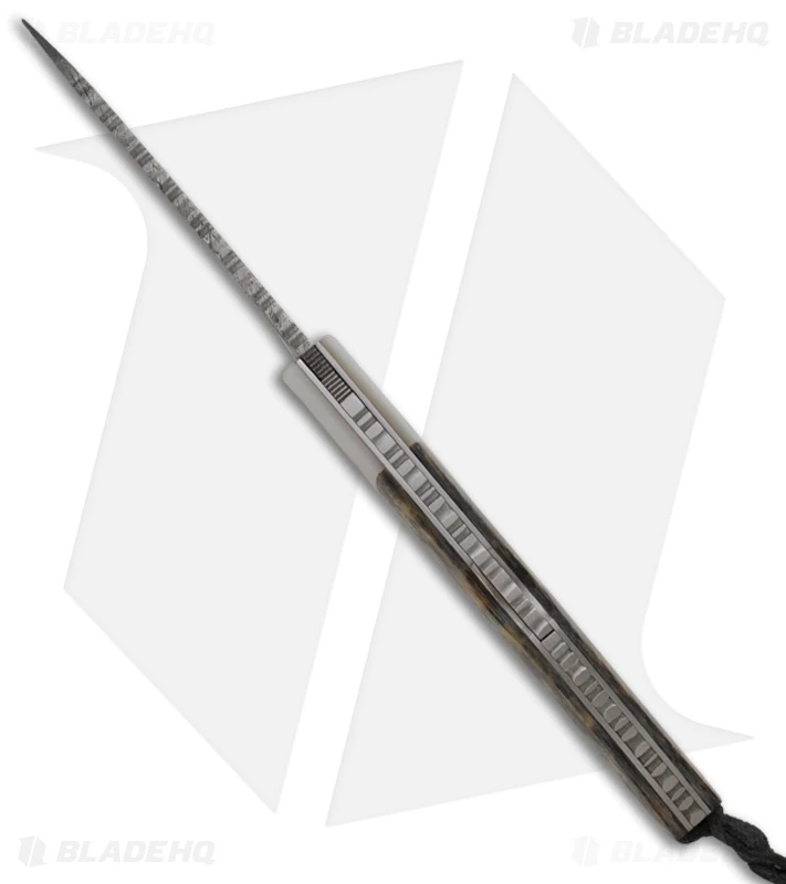 - Blade: Heinskingringla Damascus drop point blade that’s been filed along the spine for extra control.