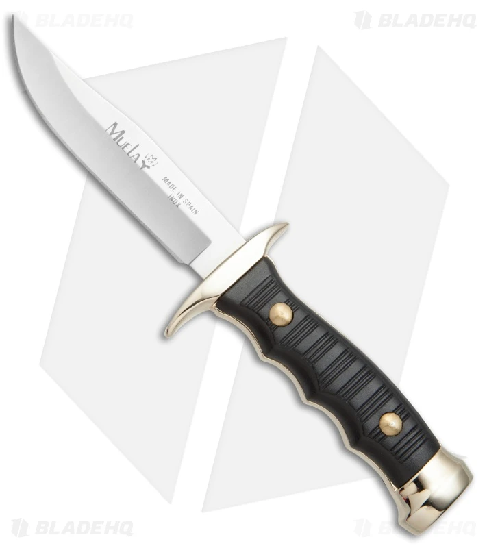 The Muela Premium Bowie features a stainless steel clip point blade with a satin finish and a plain edge. Its grooved handle scales provide added traction for a firm grip during use. The Premium Bowie fixed blade makes a great collector’s item, or everyday utility knife. This model has a brass handle with black Kraton scales. Includes a black leather belt sheath for secure carry.
