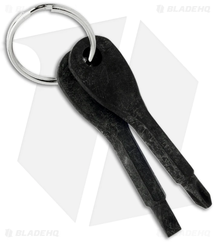 Black finished stainless steel flat and Phillips screwdrivers with hole for attachment to your keychain.