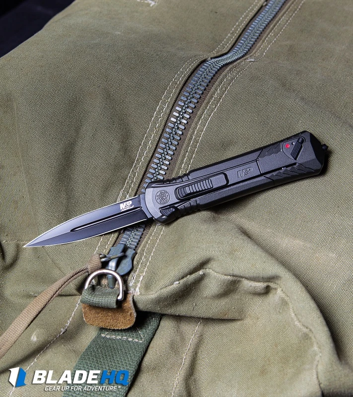 The Smith & Wesson M&P OTF offers spring assisted single-action deployment with a press of the thumb slide. A locking feature at the top of the handle releases the blade for manual closing. Once open, the knife is a capable EDC/tactical cutting tool, and because of its out-the-front nature, it offers a double-edge blade. As an added perk, launching that assisted mechanism is a ton of fun!
