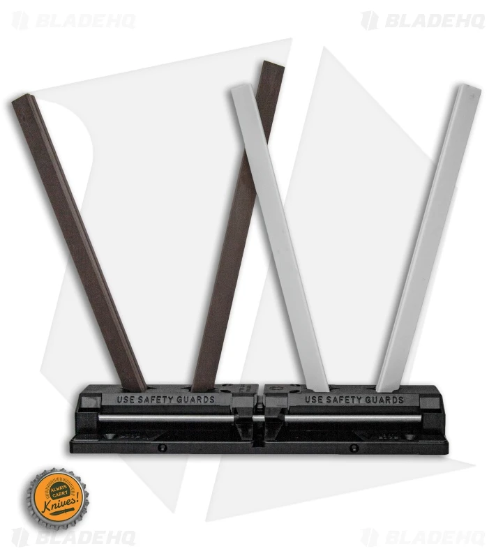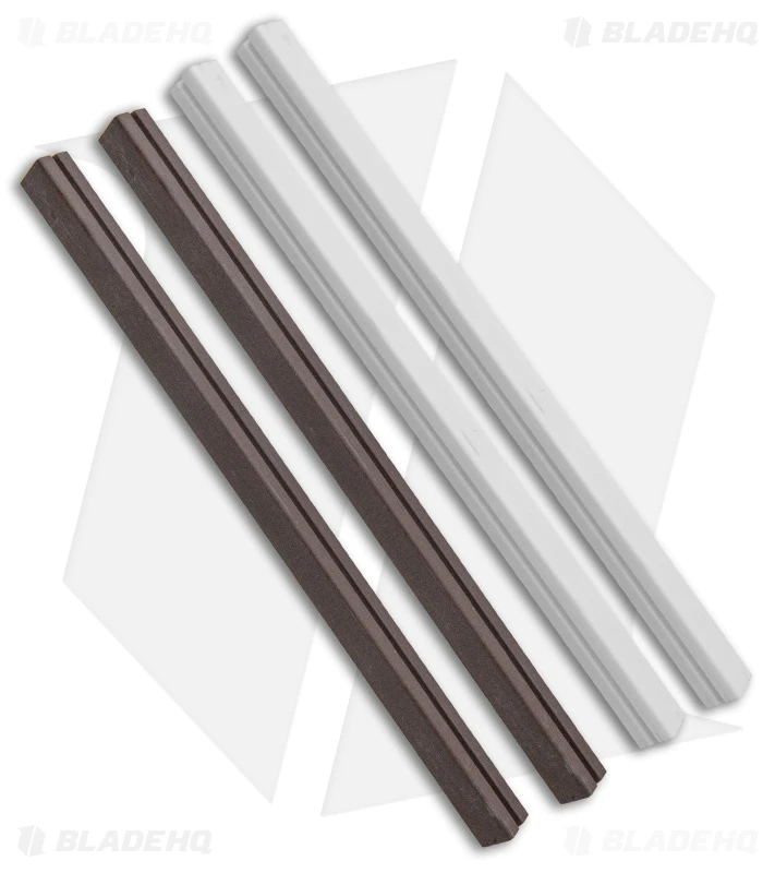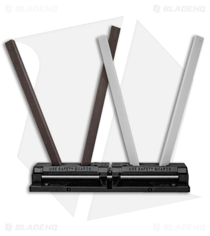 The Tri-Angle Sharpmaker (204MF) includes two sets of high alumina ceramic stones: A pair of medium-grit (brown) stones for aggressive knife sharpening and a set of fine (white) stones for professional grade finishing. The stones are triangular for sharpening Plainedges on the flat sides and SpyderEdges (serrations) on the corners. A furrow running the length of each stone lets you sharpen pointed items like fishhooks, darts and awls. Included is a set of aluminum safety rods protecting the users hands while sharpening.