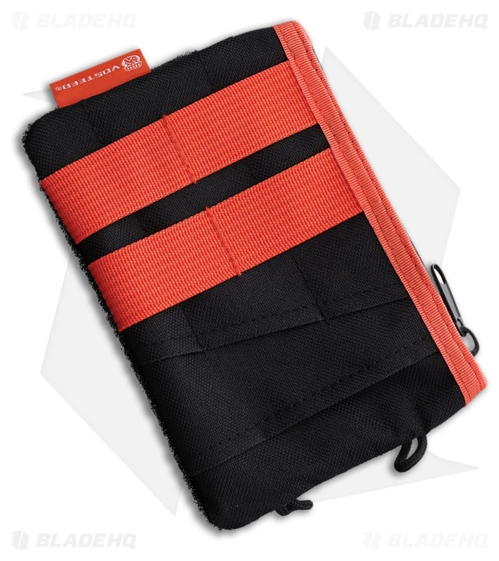 The Vosteed VOSPOUCH is a compact and practical knife pouch made from durable black and orange nylon. It features a Velcro fastener on the back, making it easy to attach to belts, bags, or other compatible surfaces. The pouch also has a hook-and-loop panel on the back, external pockets for additional storage, and a secure zipper closure. This pouch is ideal for safely carrying small knives and other tools.