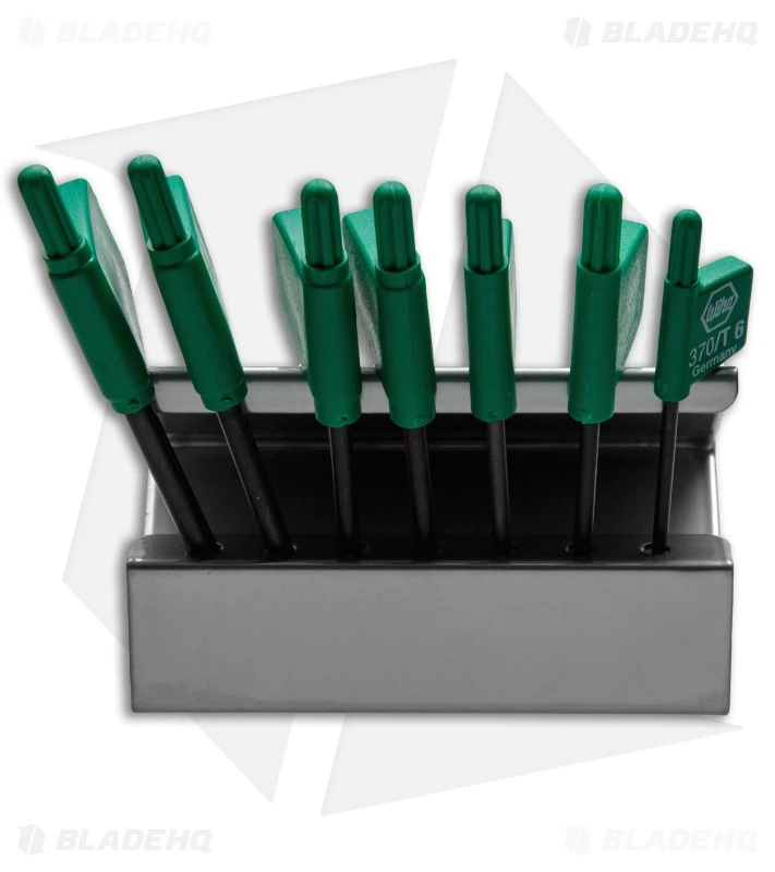 This Wiha Torx Set offers a molded flag handle design for high torque transfer with small size screws. Each Torx is made from special chrome-vanadium-molybdenum tool steel with a top spinner grip knob. They have been through hardened for maximized wear resistance with a black coating for corrosion resistance. Item includes a compact metal stand for convenient storage.